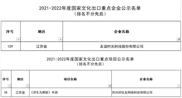 日前,商務(wù)部、中宣部、財(cái)政部、文化和旅遊部、國家新聞出版廣電總局五部委聯(lián)合發(fā)布2021-2022年度國家文化出口重點(diǎn)企業(yè)和重點(diǎn)項(xiàng)目名單。友誼時(shí)光科技股份有限公司(以下簡稱“友誼時(shí)光”,英文名:FriendTimes Inc.)被評(píng)為“2021-2022年度國家文化出口重點(diǎn)企業(yè)”,友誼時(shí)光旗下《浮生為卿歌》手遊被評(píng)為“2021-2022年度國家文化出口重點(diǎn)項(xiàng)目”。